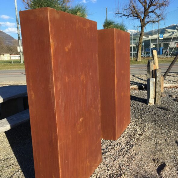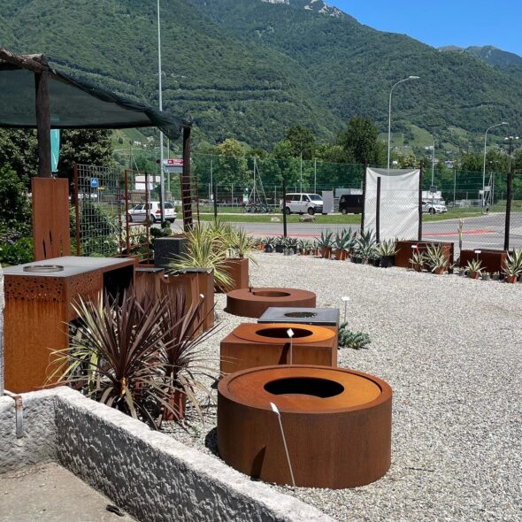 Le opere in acciaio Corten proposte spaziano dalle semplici decorazioni a elementi più funzionali come pannelli per il verde verticale, bordure per aiuole, e mobili urbani, ciascuno in grado di elevare lo spazio circostante con un tocco di eleganza industriale.
